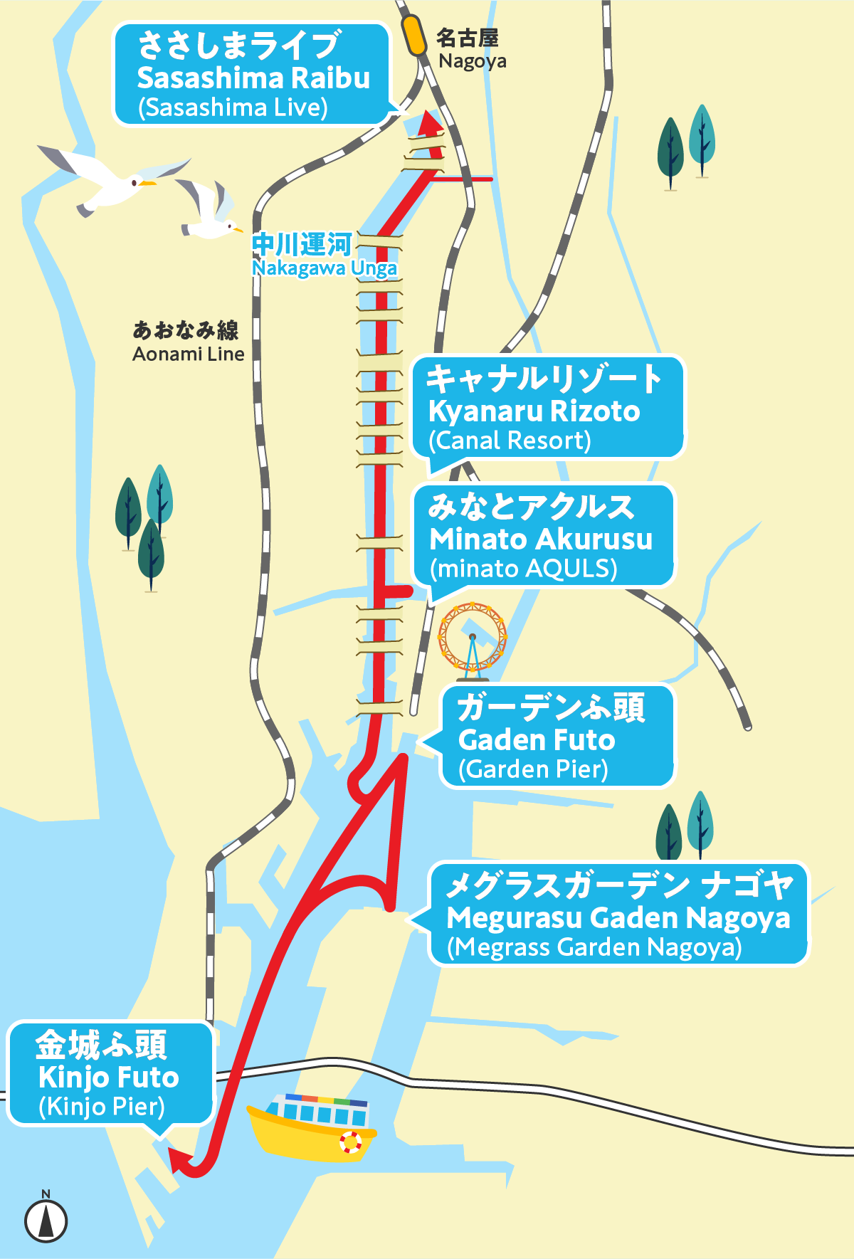 Along the way, you also can stop at various sightseeing spots such as the onsen hot spring Canal Resort, the modern minato AQULS (home to the massive LaLaport shopping center), and the Port of Nagoya Public Aquarium.