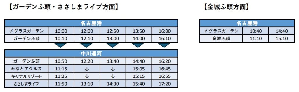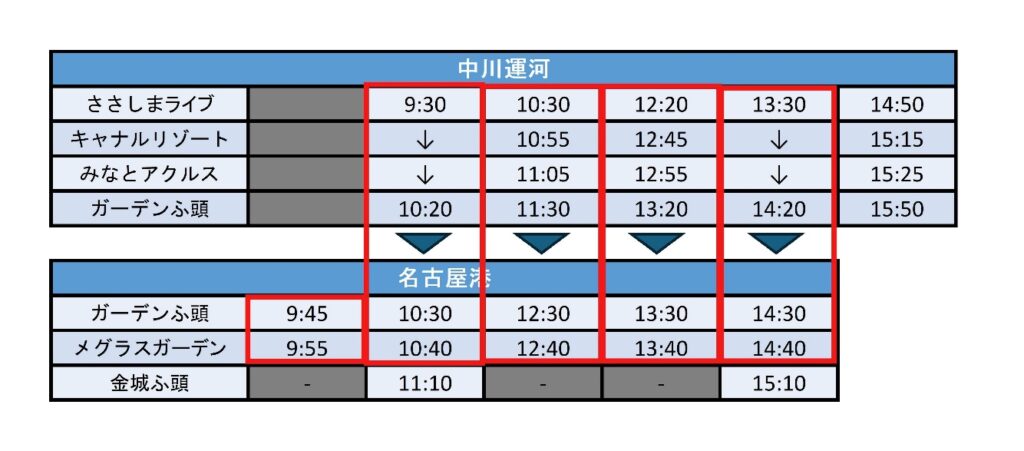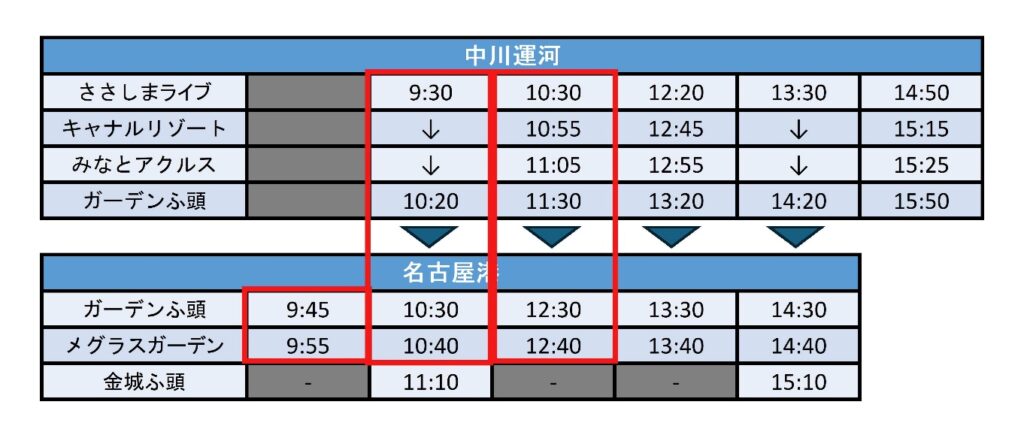 対象便:下記赤枠内の便で、メグラスガーデン ナゴヤまで乗船いただく方が対象です。