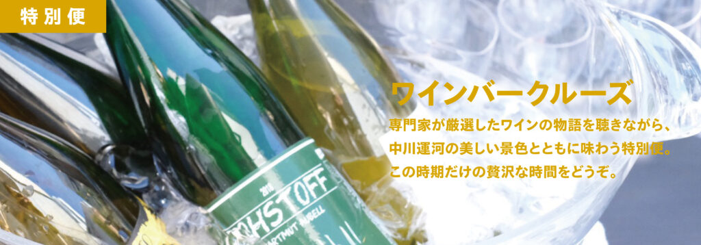 専門家が厳選したワインの物語を聴きながら、中川運河の美しい景色とともに味わう特別便。ワインに合わせた美味しいおつまみもご用意予定。この時期だけの贅沢な時間をどうぞ。